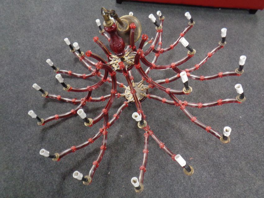 A contemporary red glass eight branch chandelier with twenty four lights