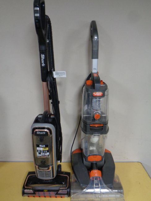 A Vax carpet washer and a Shark corded upright vacuum cleaner
