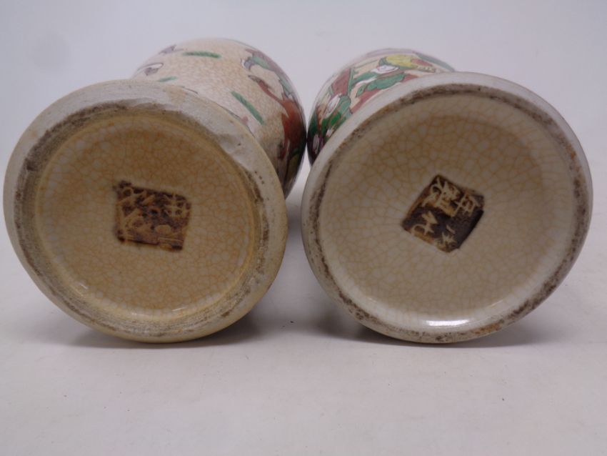 Two Japanese crackle glazed vases, depicting Samurai in battle, character marks to base, height 26 cm and 27.5 cm