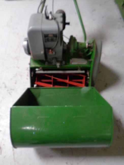 A vintage Qualcast Suffolk engine model 22A type 7SG14 petrol lawn mower with grass box and roller