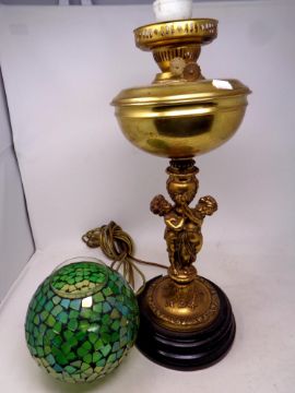An antique brass oil lamps on figural column and later glass mosaic shade (converted)