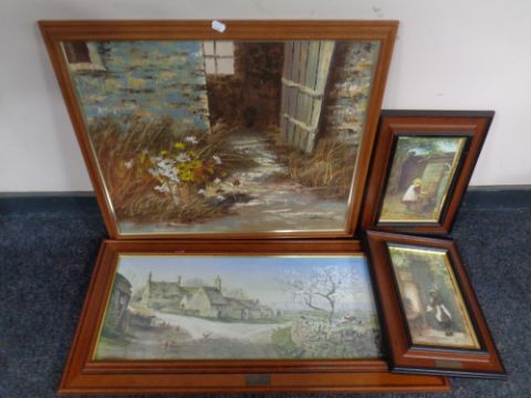 A Chadwick oil on canvas, farm yard, together with three further framed prints - The Visitor, Fetching Water and Upper Wall farm
