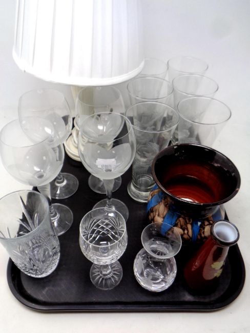 A tray of assorted drinking glasses, Swedish pottery vase, table lamp and shade