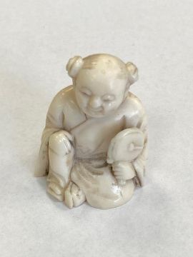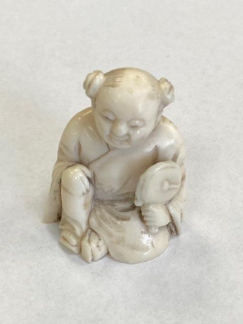 A Japanese netsuke depicting a figure holding a fan, height 35 mm.