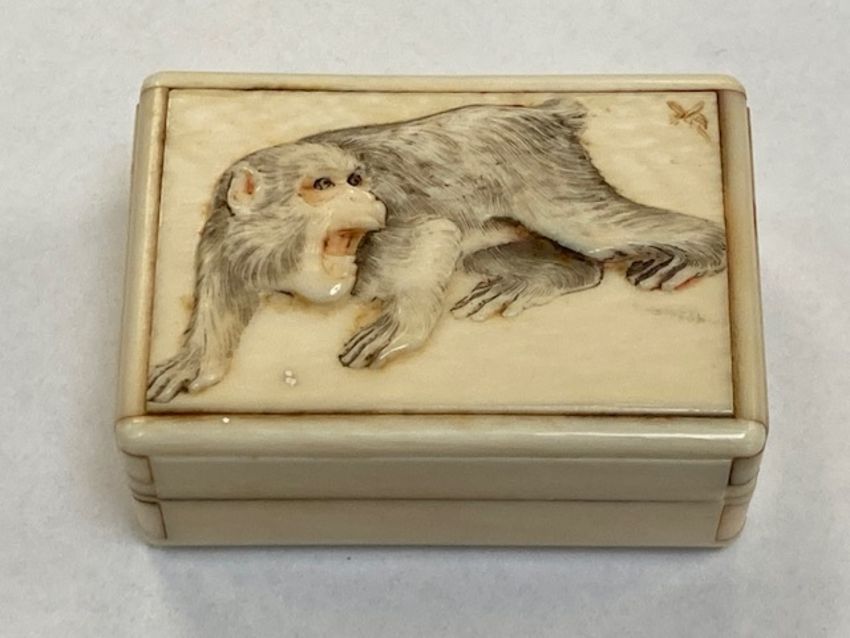 A carved Japanese early 20th century ivory lidded box, 50 mm x 35 mm x 20 mm.