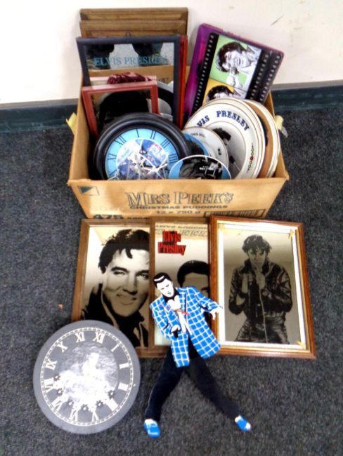 A box containing Elvis Presley memorabilia to include framed picture mirrors, wall clocks, wall plates, plaques etc