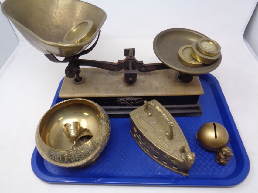 A tray of vintage set of pan scales with weights, brass ware - money box, flat iron, Eastern bowl and bells