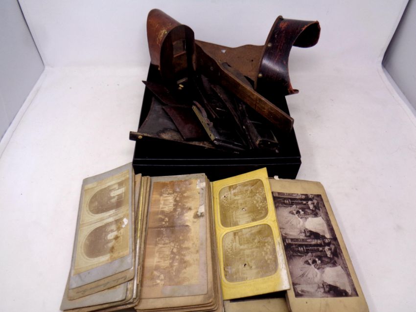 A box of antique stereo scope viewers and parts, quantity of stereoscope slides