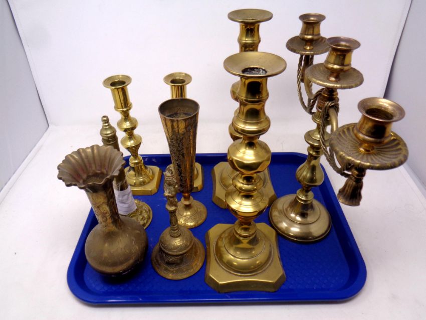 A tray of antique and later brass ware, two pairs of candlesticks, three way table candelabra, Eastern brass vases