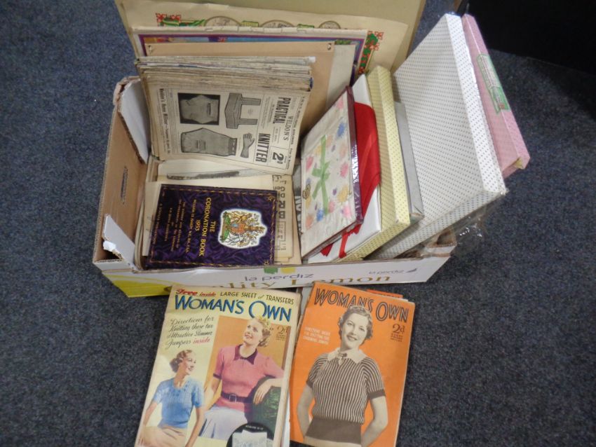A box of 1930s volumes : Woman's Own, vintage Practical Knitters, Northern Echo Coronation special edition news paper, monochrome portraits, boxed linens etc