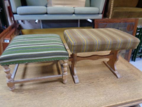 A square blond oak footstool together with a refectory dressing table stool, both upholstered in a striped fabric