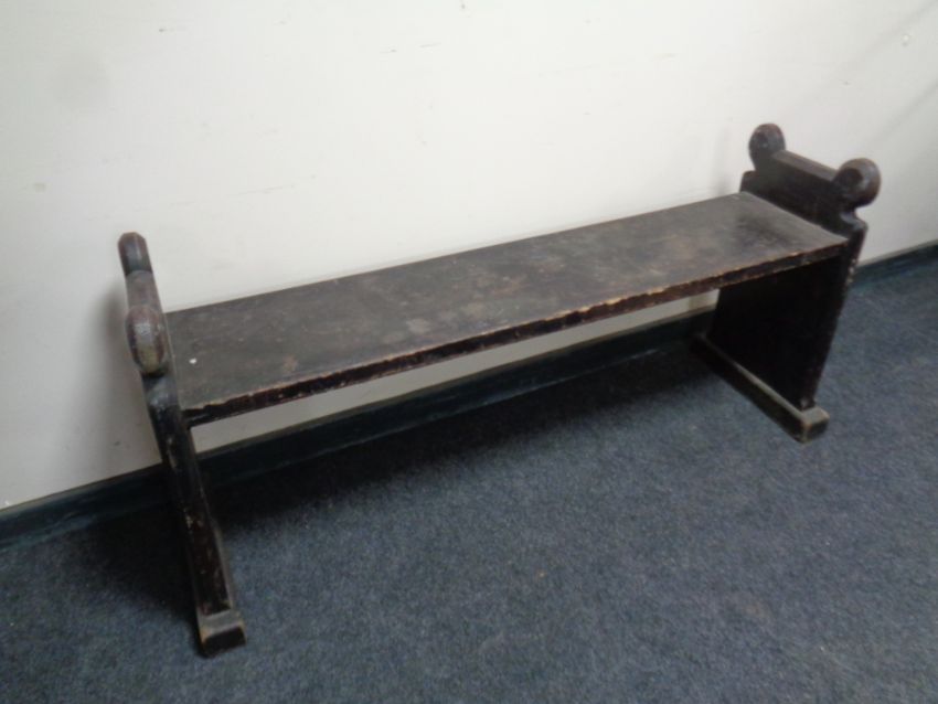 An antique pine bench (made from a church pew), length 132 cm.