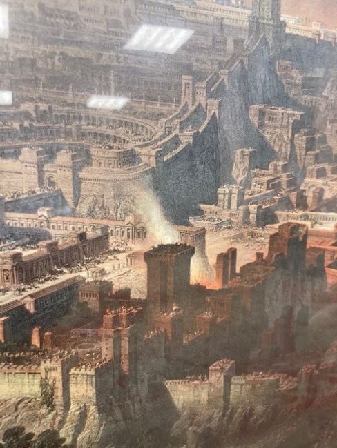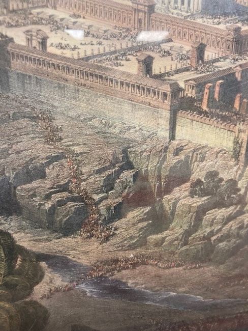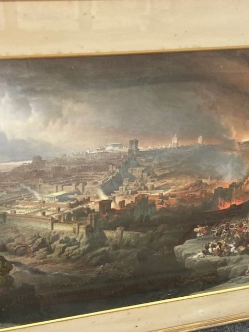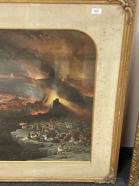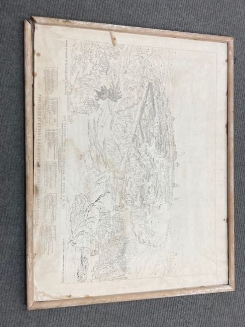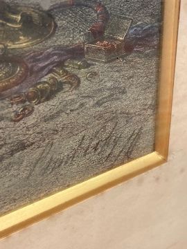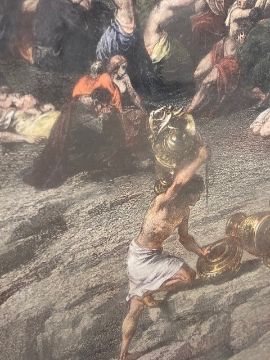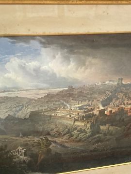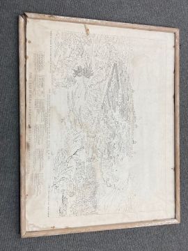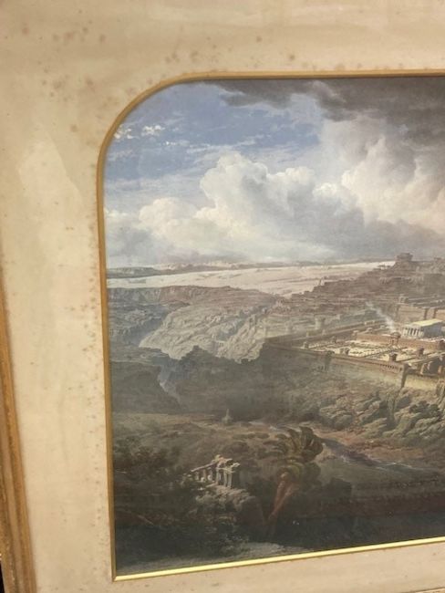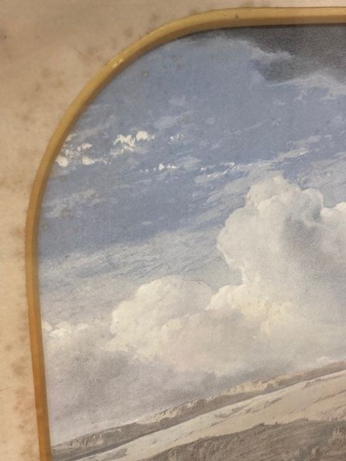 This has not be examined out of the frame. The condition of the print looks good. There are a few noticeable spots to the blue sky area in the upper left corner. Otherwise there doesnt appear to be areas of clear damage or staining, holes or problems to report. The mount is foxed in areas and the frame requires attention. The monochrome key to the work is not in good condition, areas of staining can be seen, the frame is falling apart and overall although the image is visible clearly enough it is in poor condition.