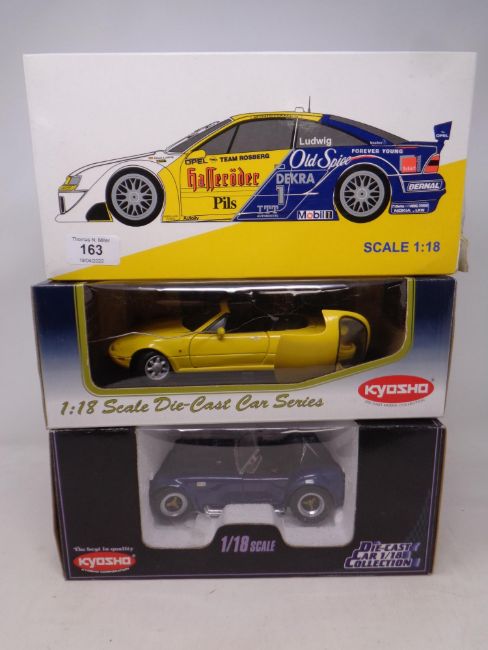Three 1:18 scale die cast cars - Team Rosberg Collection Opel Calibra 1995, Kyosho Mazda MX5 Miata and a Kyosho Shelby Cobra 427s/c, all boxed