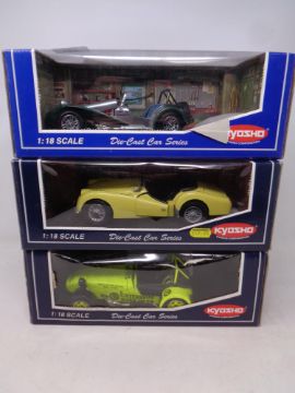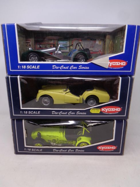 Three Kyosho 1:18 scale die cast cars - two x Super 7 JPE and a Triumph 3 yellow, boxed