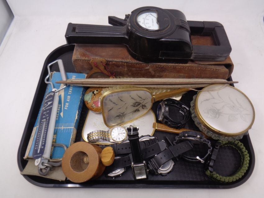 A tray of twentieth century Bakelite cased Ammeter by Ferranti in leather case together with dressing table set, Salter luggage scales etc