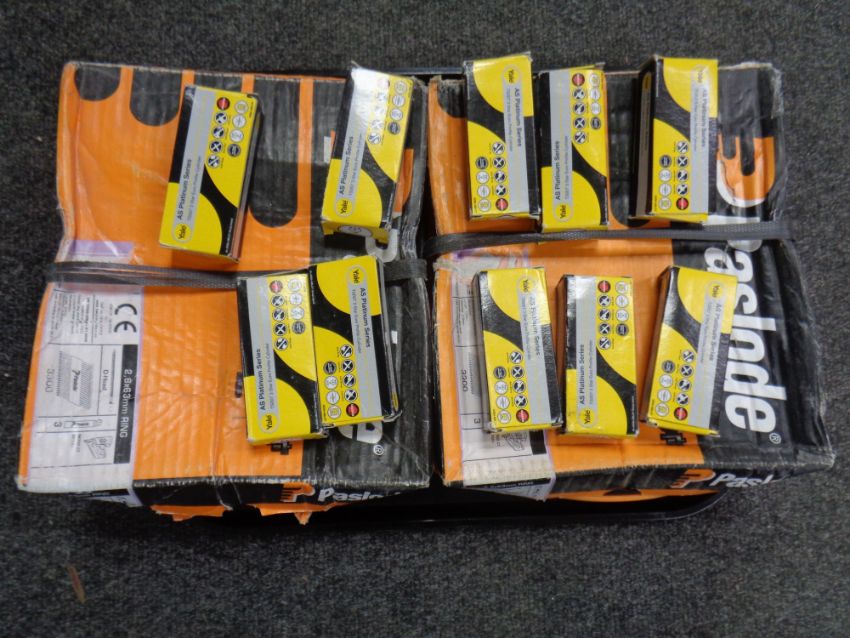 Two boxes of Paslode D-head nails together with ten Yale AS platinum series lock cylinders, all boxed as new.