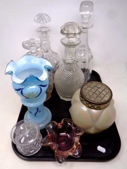 A tray of antique and later glass, decanter, blue glass vase, preserve pot etc