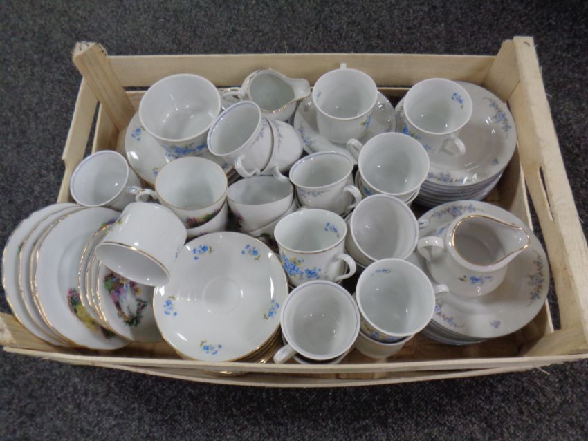 A crate containing a Czech tea service, West German tea service together with a part English bone china tea service