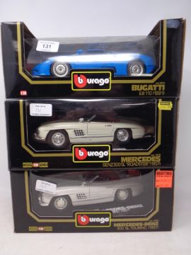 Two Burago Diamonds 1:18 die cast cars - Mercedes Benz SL 300 Roadster 1957, Mercedes Benz SL Touring and a Burago 1:18 model - Bugatti EB110 1991, all boxed