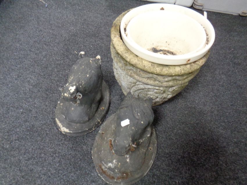 A concrete planter together with two horse head plaques, small quantity of galvanised buckets.