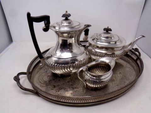 A silver plated oval twin handled serving tray together with a Sheffield plated three piece tea service