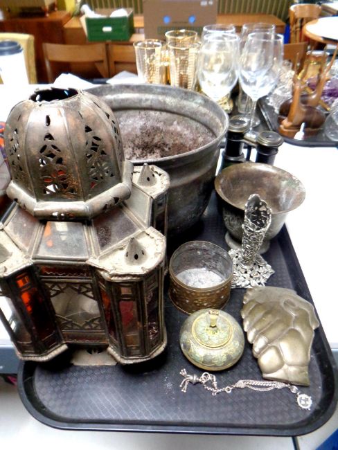A tray containing vintage opera glasses, antique and later metal wares, copper planter, Moroccan style tea light holder, metal ashtray etc