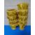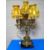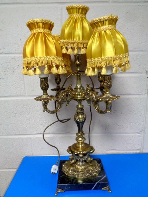A decorative gilt metal five-way table lamp with gold tasseled shades on black marble base