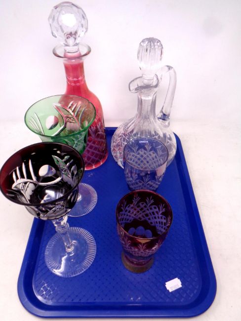A tray of cut glass two tone decanter, pair of wine glasses and beakers, further crystal decanter