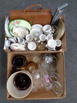 Two boxes of glass ware, Carlton ware bowl, tea china, money box, faux snakeskin briefcase