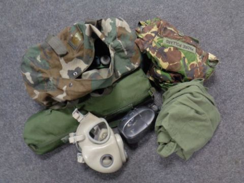 Two bags containing British military equipment to include uniform, drinks canteen, gas mask etc