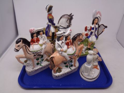 A tray of pair of Staffordshire figures -Returning home and going to market, porcelain figure Officer on horseback, Spanish figure of a child etc
