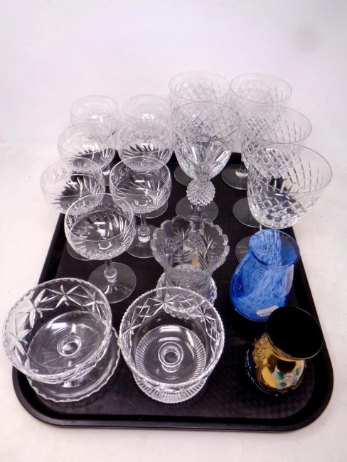 A tray of glass ware, desert bowls, German thistle candlestick, Caithness vase etc
