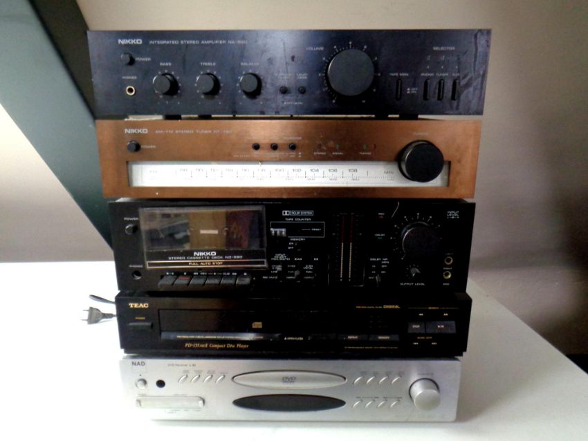 A Nikko integrated stereo amplifier NA-590, Nikko stereo tuner NT 790, Nikko stereo cassette deck ND-590, TEAC compact disc player and an NAD dvd receiver (continental wiring)