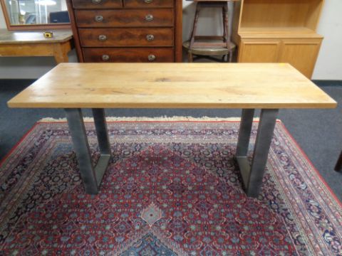 An oak topped refectory dining table on metal industrial style legs