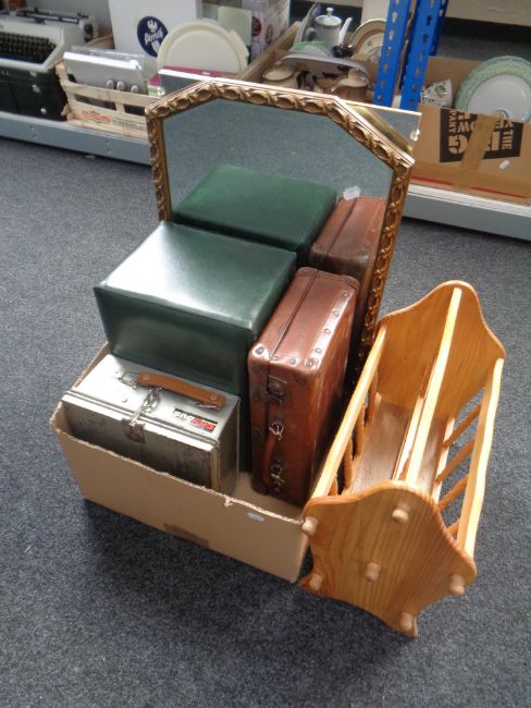 A pine magazine rack together with a box containing small vintage leather suitcase, gilt framed mirror, frameless mirror etc