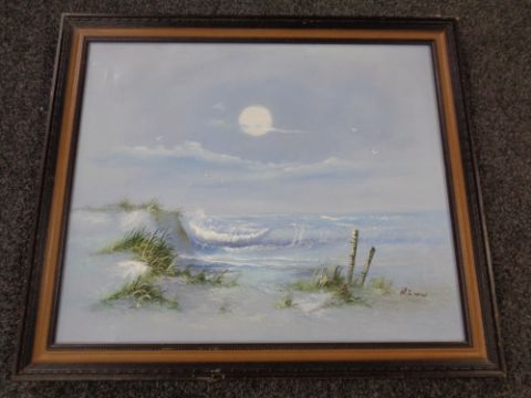 A cased laser level together with a further cased bbq set and oil on canvas - Coastal scene.