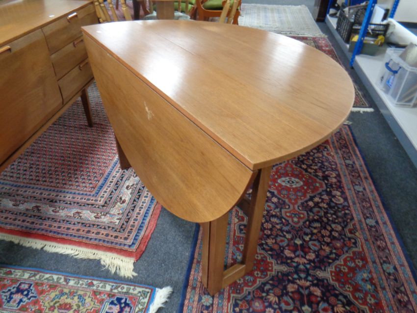 A mid century teak six piece dining room suite comprising of cocktail sideboard, narrow drop leaf table and four chairs