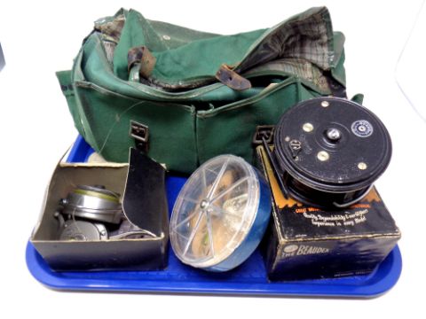 A canvas fishing bag containing a Beaudex reel, boxed, fishing hooks, Movado reel with line