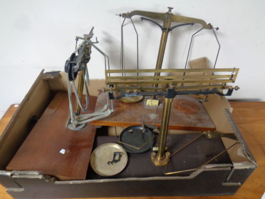 A box of three antique sets of scales