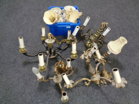 A box containing four continental brass and metal chandeliers together with a box containing light shades and bulbs