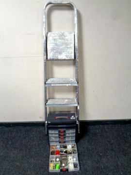 A set of aluminium folding steps together with a plastic six drawer chest containing fixtures, fittings, curtain hooks etc