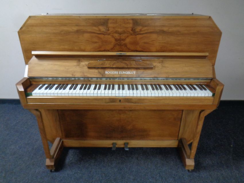 A Rogers Eungblut walnut cased Art Deco upright overstrung piano