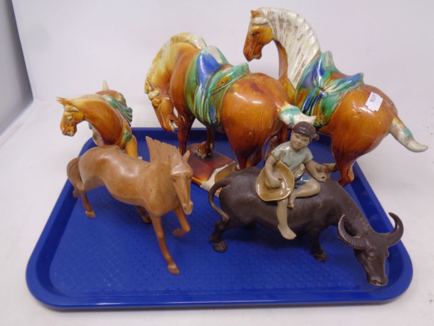 A tray containing Chinese ceramic Tang style horses, figure of a girl, carved wooden horse