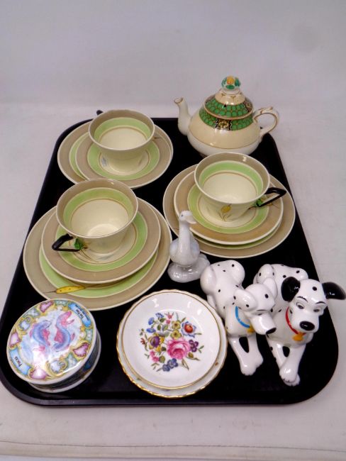 A tray of ceramics, Disney Dalmatian, Royal Worcester and Minton dishes, three Burleigh ware china trios etc