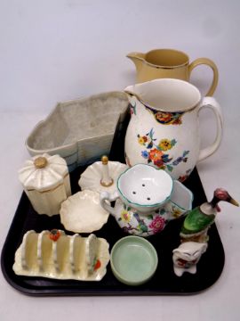 A tray of ceramics, George V Wedgwood jug, Beswick planter and toast rack, Coalport ivory gilded pieces etc
