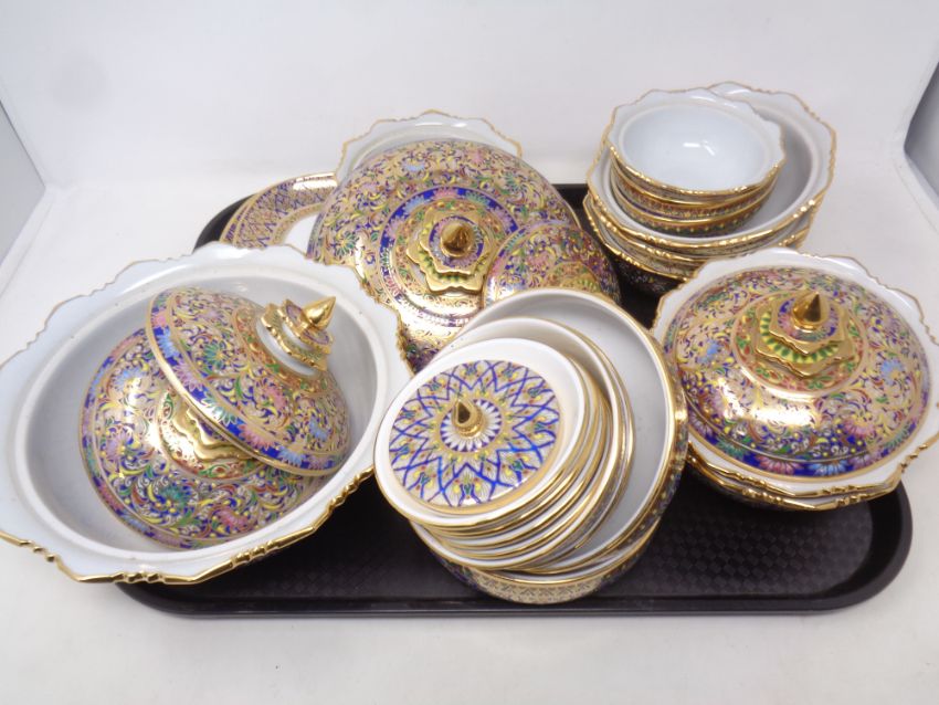 A tray of a quantity of hand painted Taiwanese Patra porcelain dishes and bowls
