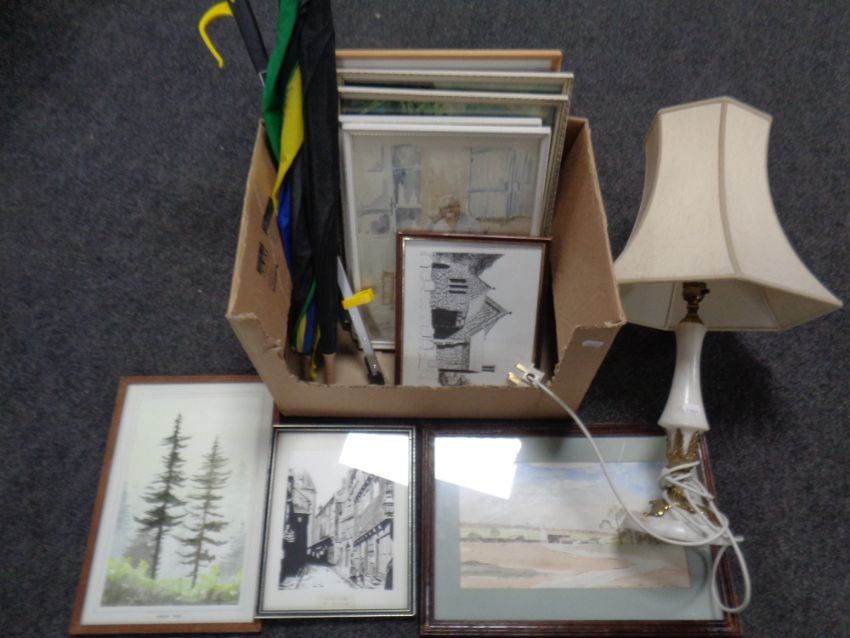 A brass and marble table lamp with shade together with a box containing assorted framed pictures and prints, watercolours, umbrellas