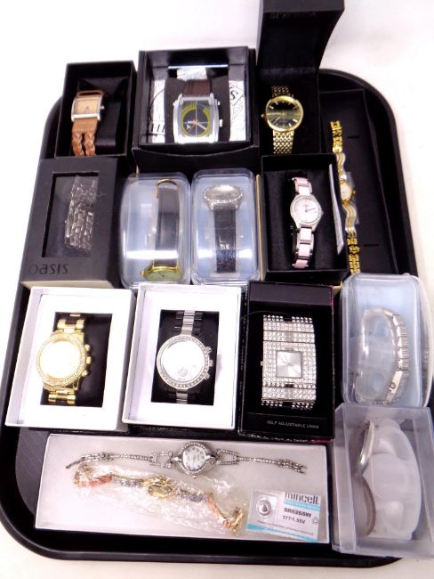 A tray contained box of lady's and gents wristwatches including Oasis, Sekonda etc