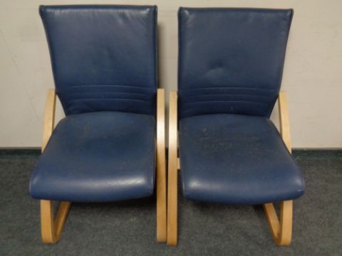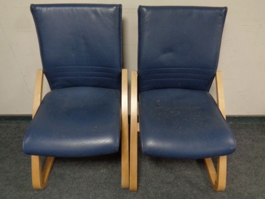 A pair of Alan Cooper beach framed chairs upholstered in blue leather